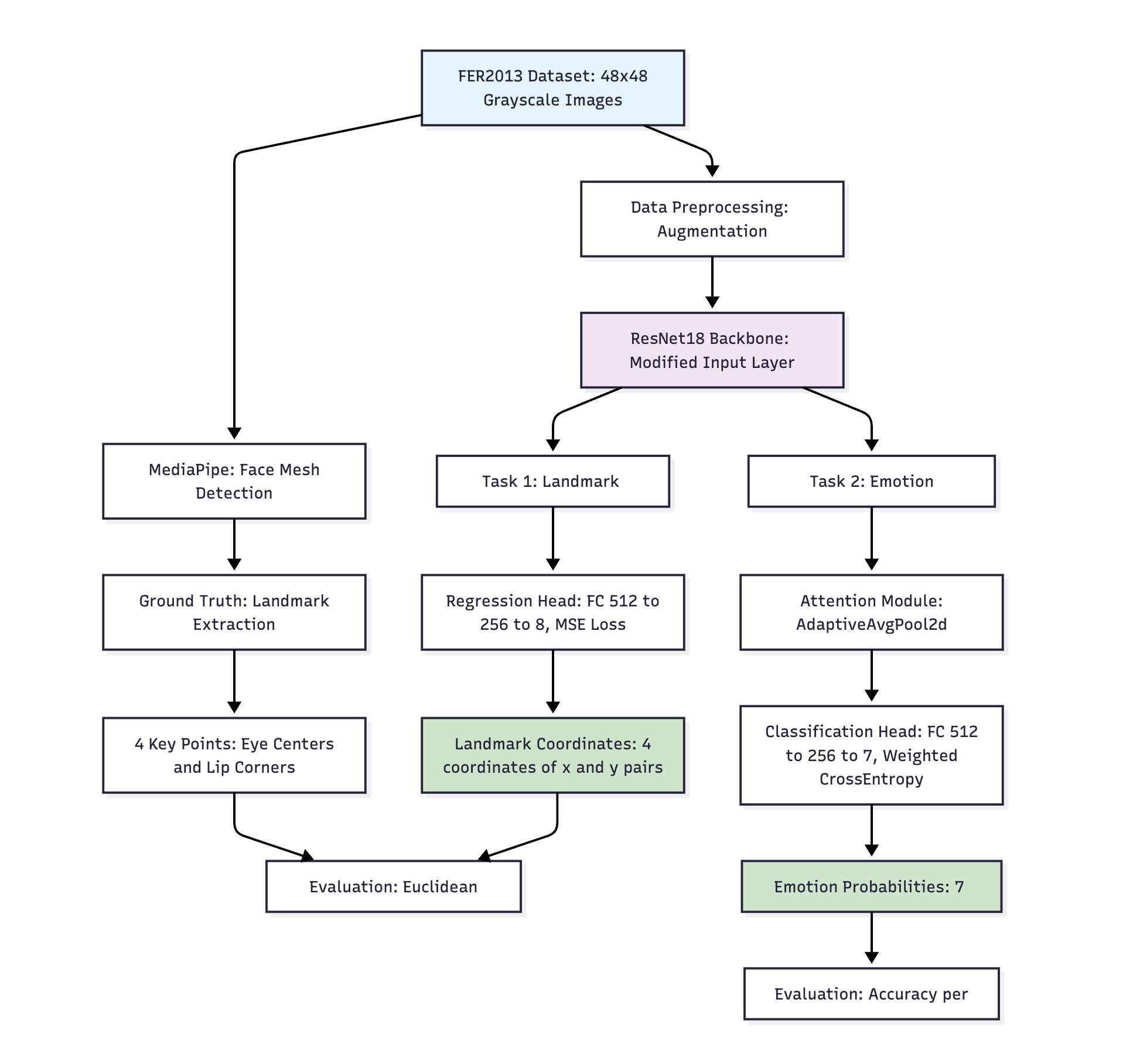 A two-stage facial expression recognition pipeline using MediaPipe for landmark detection and a modified ResNet18 with self-attention for emotion classification.
