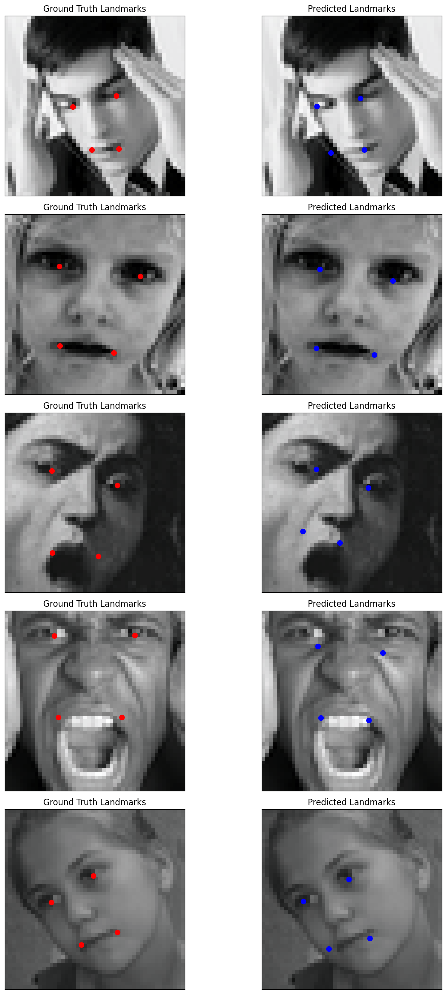 The above visualization shows the predicted landmarks (blue) compared to the ground truth (red) on sample images. The model effectively captures key facial features, demonstrating its robustness against noise and low resolution.